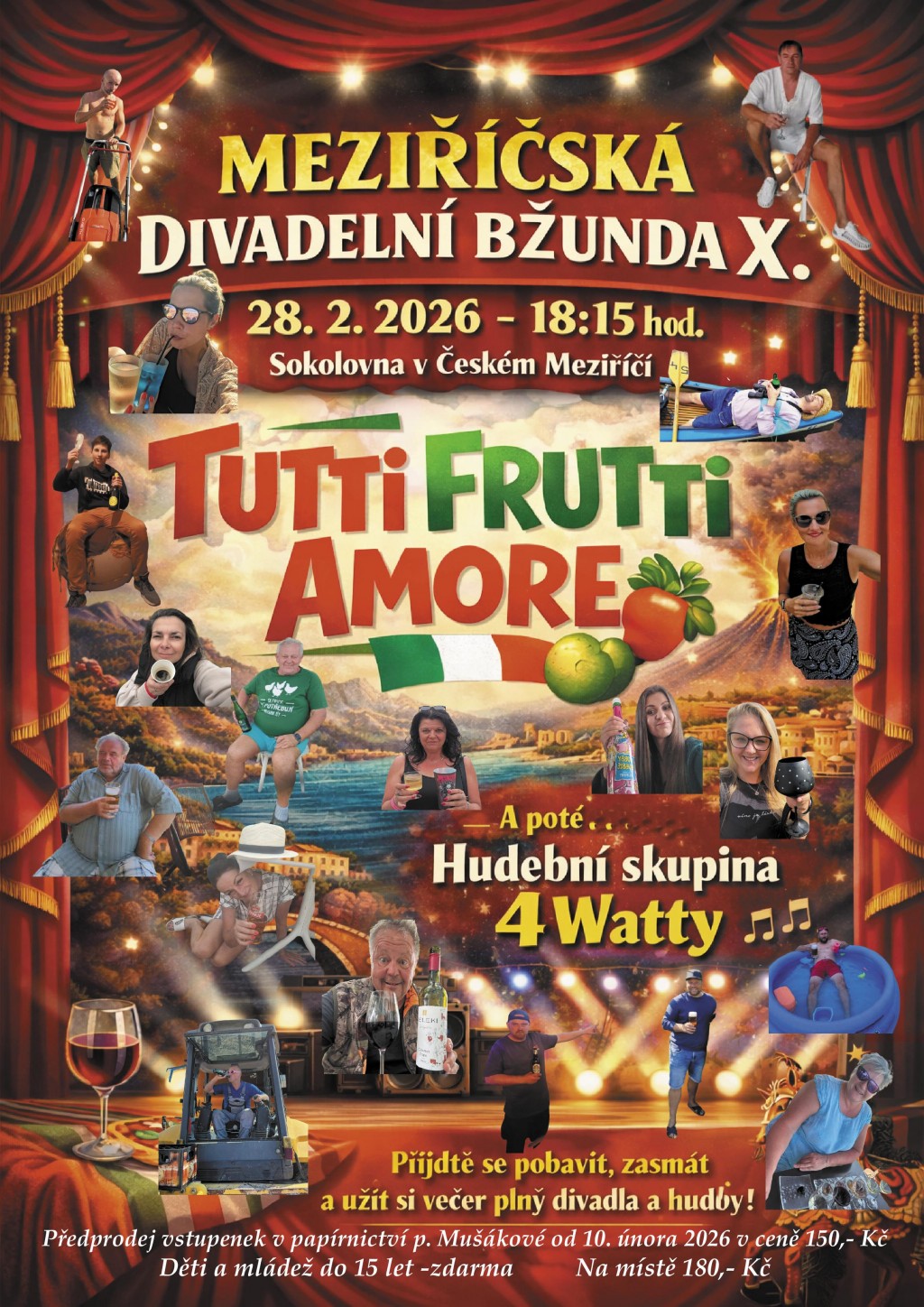 Dovolte nám, abychom Vás srdečně pozvali na jubilejní ročník Meziříčské Divadelní Bžundy X, která se uskuteční 28. února 2026 od 18:15 v naší sokolovně. V rámci večera vystoupí místní Divadelní sešlost v Českém Meziříčí s bláznivou komedií v italském stilu - Tutti Frutti Amore. Poté zahraje hudební skupina 4 watty.