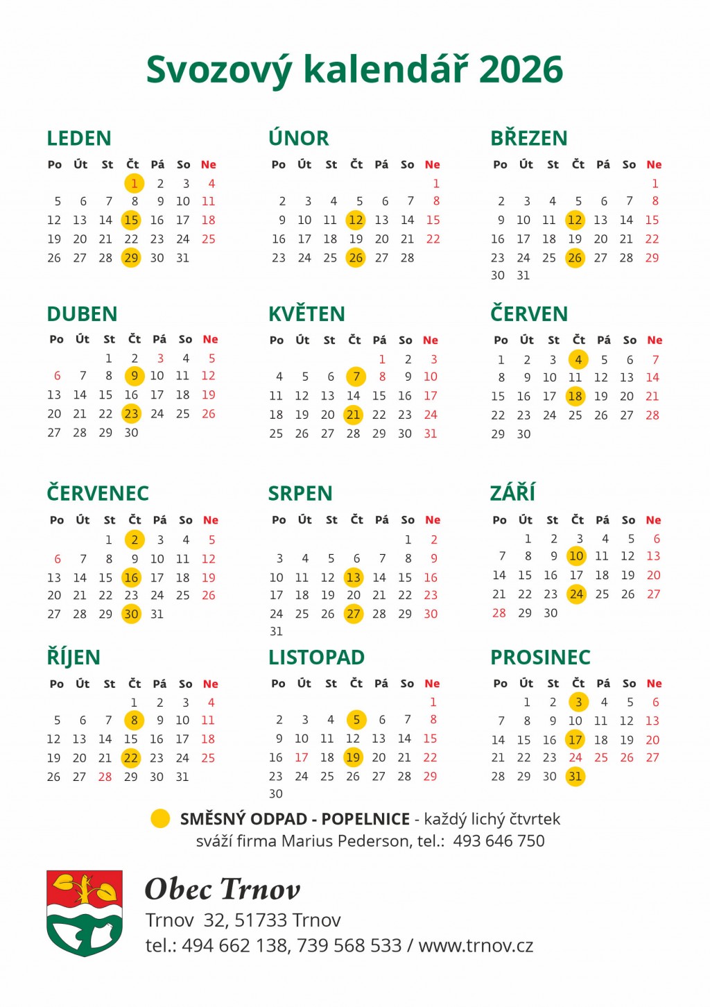 V příloze aktuality naleznete svozový kalendář - komunální odpad - vývoz lichý týden čtvrtek.