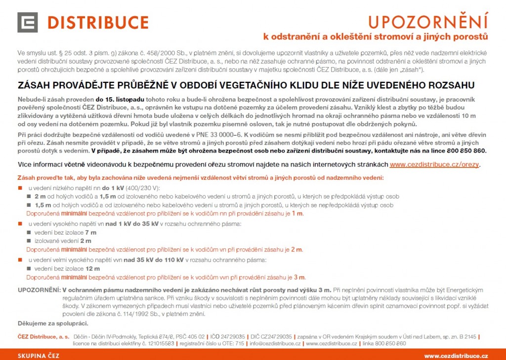ČEZ DISTRIBUCE UPOZORNĚNÍ k odstranění a okleštění stromoví a jiných porostů