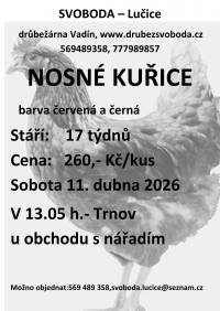 Firma Svoboda Lučice bude prodávat v sobotu 11. dubna 2026 v 13.05 hodin u prodejny s nářadím nosné kuřice, stáří 17 týdnů, cena 260,- Kč/kus, barva červená-Isa brown a černá-Morávia. Objednání je možné na tel. 569 489 358 nebo emailem svoboda.lucice@seznam.cz