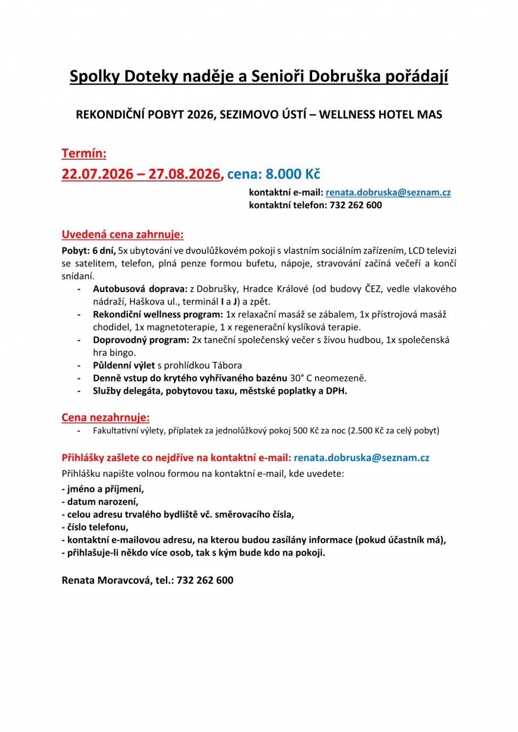 V příloze zasíláme písemné nabídky o pořádaných pobytových zájezdech pro seniory z Dobrušky a okolí.