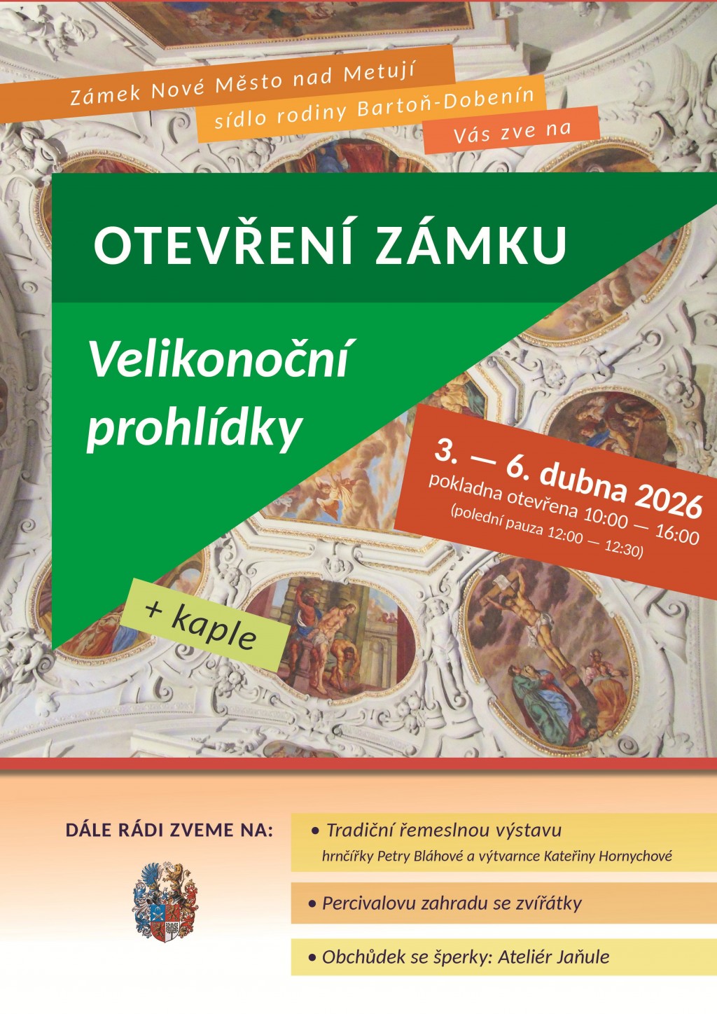 Zavítat k nám na zámek můžete i během prodlouženého velikonočního víkendu. Zámecké interiéry se promění ve svátečně vyzdobený prostor a navíc v nich budete mít poslední možnost obdivovat prvorepublikové hračky z Muzea hraček v Rychnově nad Kněžnou. Prohlídky budou navíc obohaceny o návštěvu zámecké kaple Povýšení svatého Kříže.