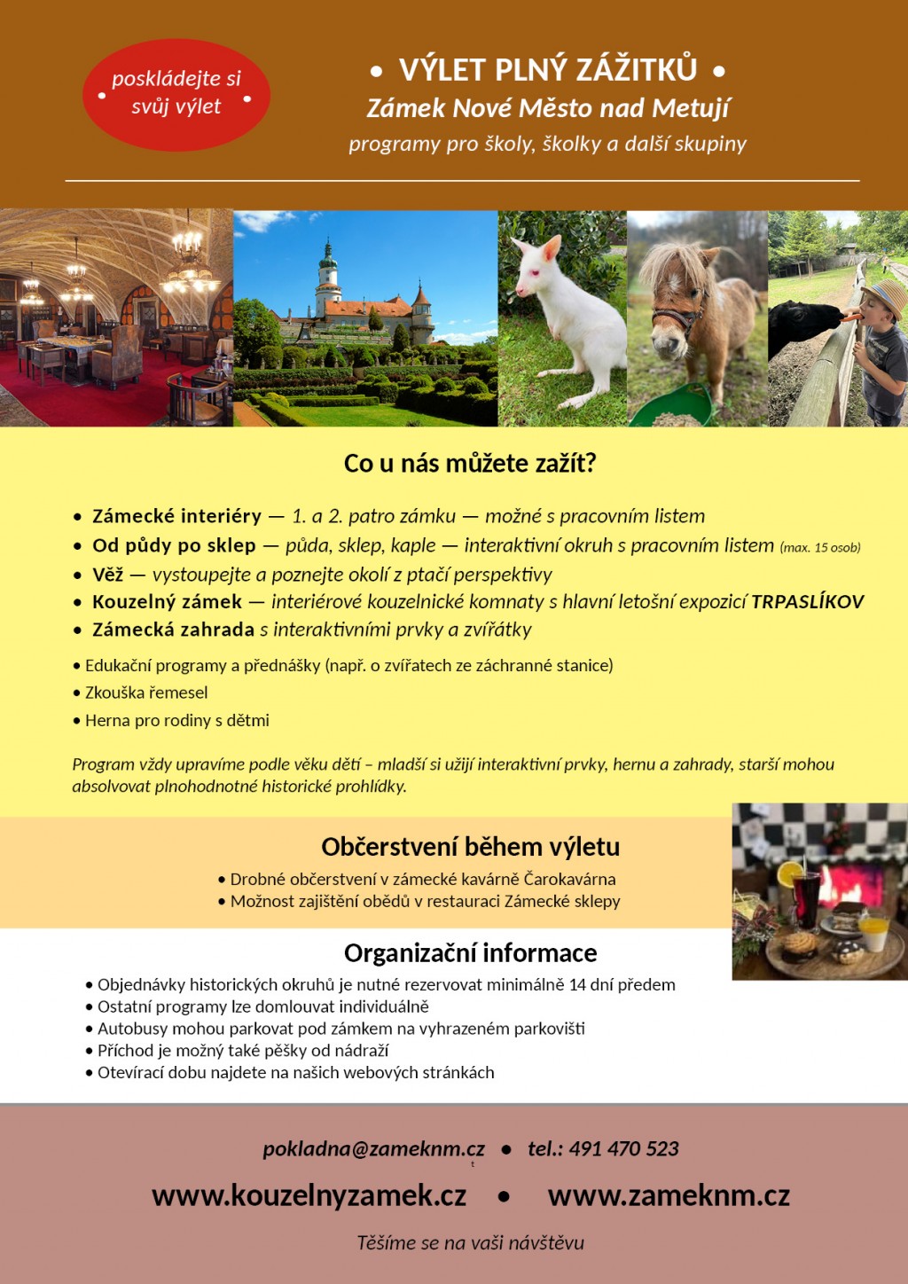 Nově si u nás můžete sestavit výlet přesně podle svých představ a věkové kategorie dětí – od jedné prohlídky až po celodenní program. Navštívit můžete dva prohlídkové okruhy zámku - Zámecké interiéry a Od půdy po sklep, vystoupat na věž Máselnici, prozkoumat expozici Kouzelného zámku s letošní hlavní výstavou TRPASLÍKOV, nebo se vydat do Percivalových zahrad s interaktivními prvky a zvířátky.