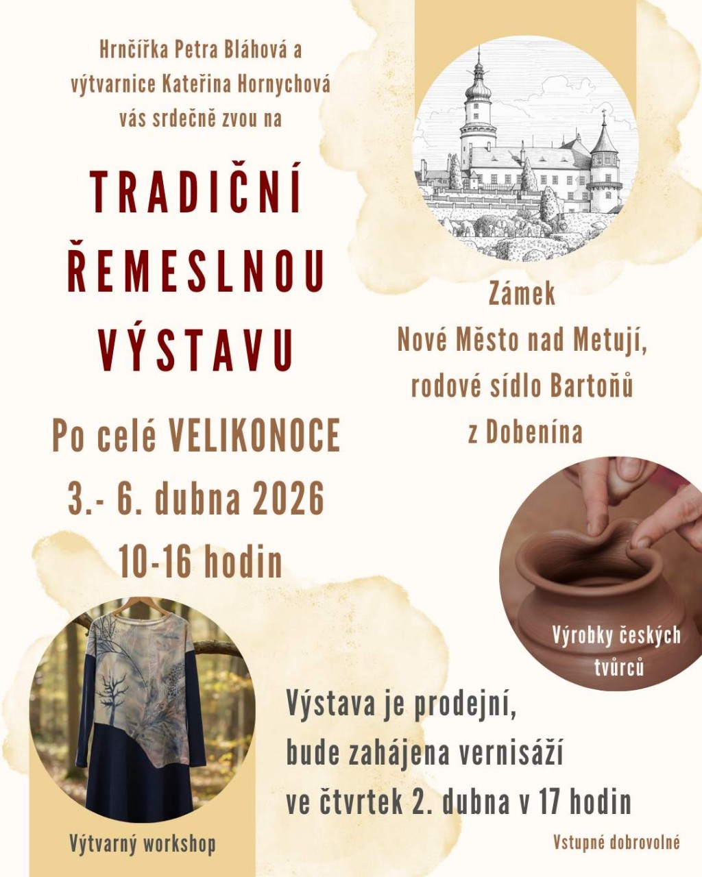 Od 3. dubna do 6. dubna si pro Vás hrnčířka Petra Bláhová a textilní výtvarnice a návrhářka Kateřina Hornychová opět připravily Tradiční řemeslnou výstavu. Akce je prodejní a bude zahájena vernisáží ve čtvrtek 2. dubna od 17 hodin.