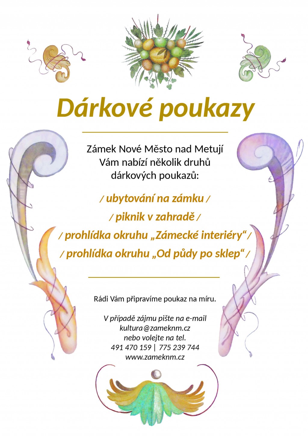 Potěšit své blízké můžete také dárkovým poukazem na ubytování, prohlídku zámku nebo piknik v zámecké zahradě – originálním dárkem k narozeninám, výročí či jiné výjimečné příležitosti.