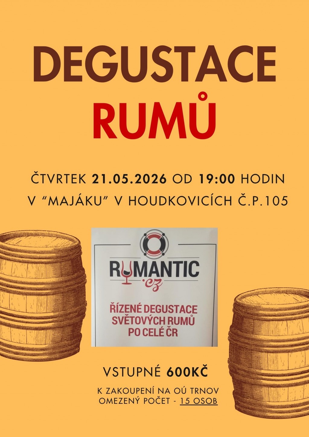 Dne 21.05.2026 od 19:00 hodin se uskuteční DEGUSTACE RUMŮ v MAJÁKU v Houdkovicích.