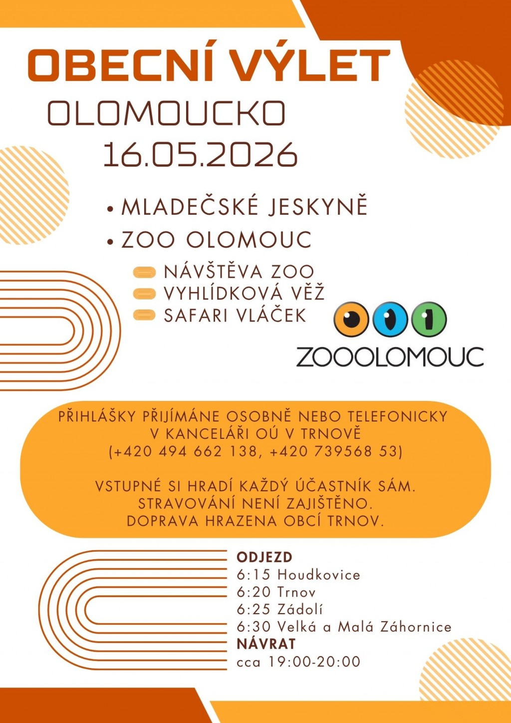 OBECNÍ VÝLET OLOMOUCKO - den konání 16.05.2026, přihlášky v kanceláři OÚ TRNOV.