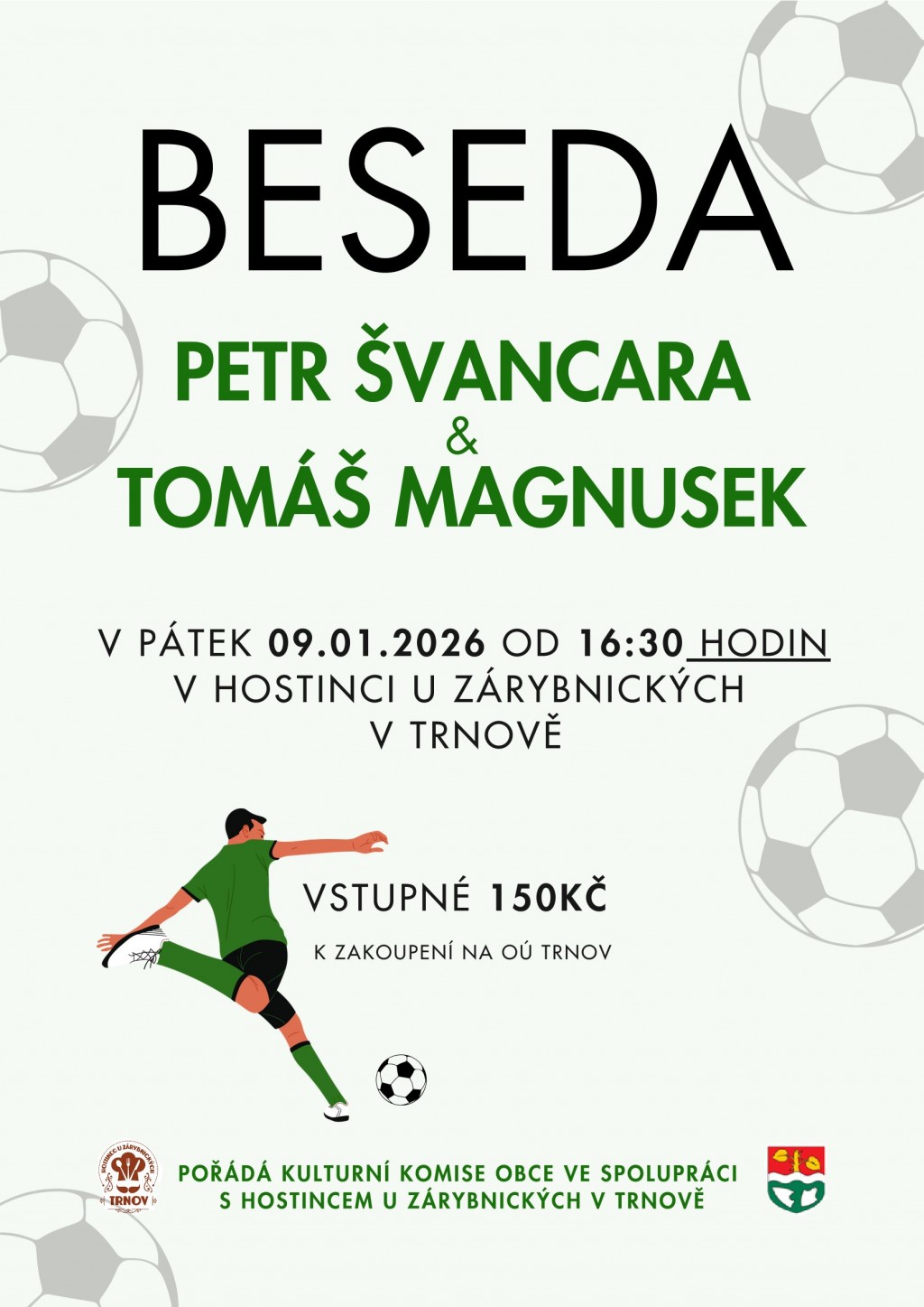BESEDA PETR ŠVANCARA & TOMÁŠ MAGNUSEK. AKCI POŘÁDÁ KULTURNÍ KOMISE OBCE VE SPOLUPRÁCI S HOSTINCEM U ZÁRYBNICKÝCH V TRNOVĚ. V PÁTEK 09.01.2026 OD 16:30 HODIN V HOSTINCI U ZÁRYBNICKÝCH V TRNOVĚ. VSTUPNÉ 150 KČ K ZAKOUPENÍ NA OÚ TRNOV.