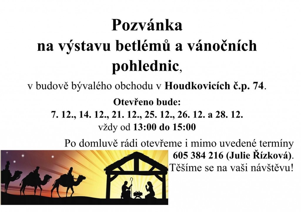 Pozvánka na výstavu betlémů a vánočních pohlednic, v budově bývalého obchodu v Houdkovicích č.p. 74.