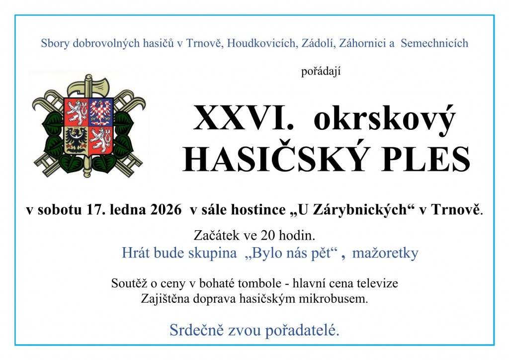 Sbory dobrovolných hasičů v Trnově, Houdkovicích, Zádolí, Záhornici a Semechnicích pořádají XXVI. okrskový HASIČSKÝ PLES v sobotu 17. ledna 2026 v sále hostince „U Zárybnických“ v Trnově. Začátek ve 20 hodin. Hrát bude skupina „Bylo nás pět“ , mažoretky. Soutěž o ceny v bohaté tombole - hlavní cena televize. Zajištěna doprava hasičským mikrobusem. Srdečně zvou pořadatelé.