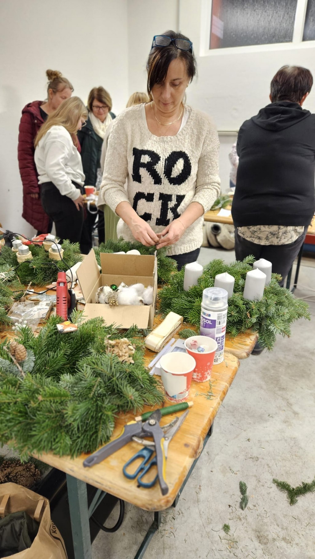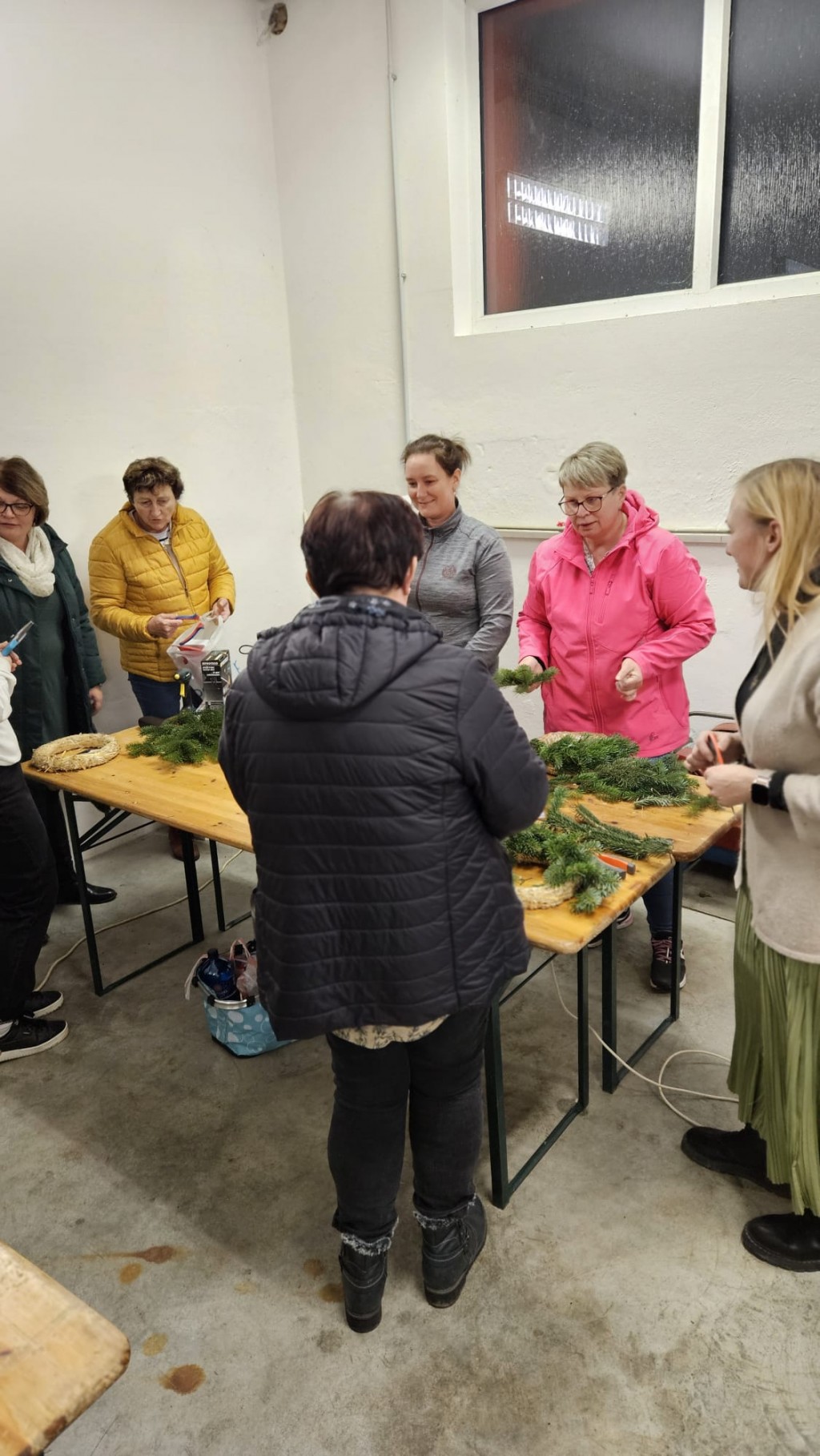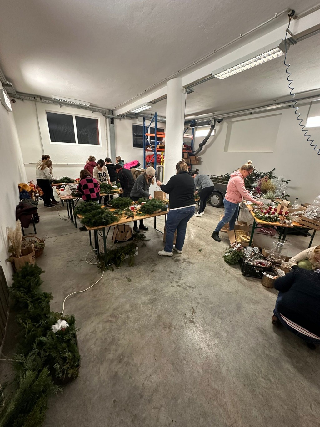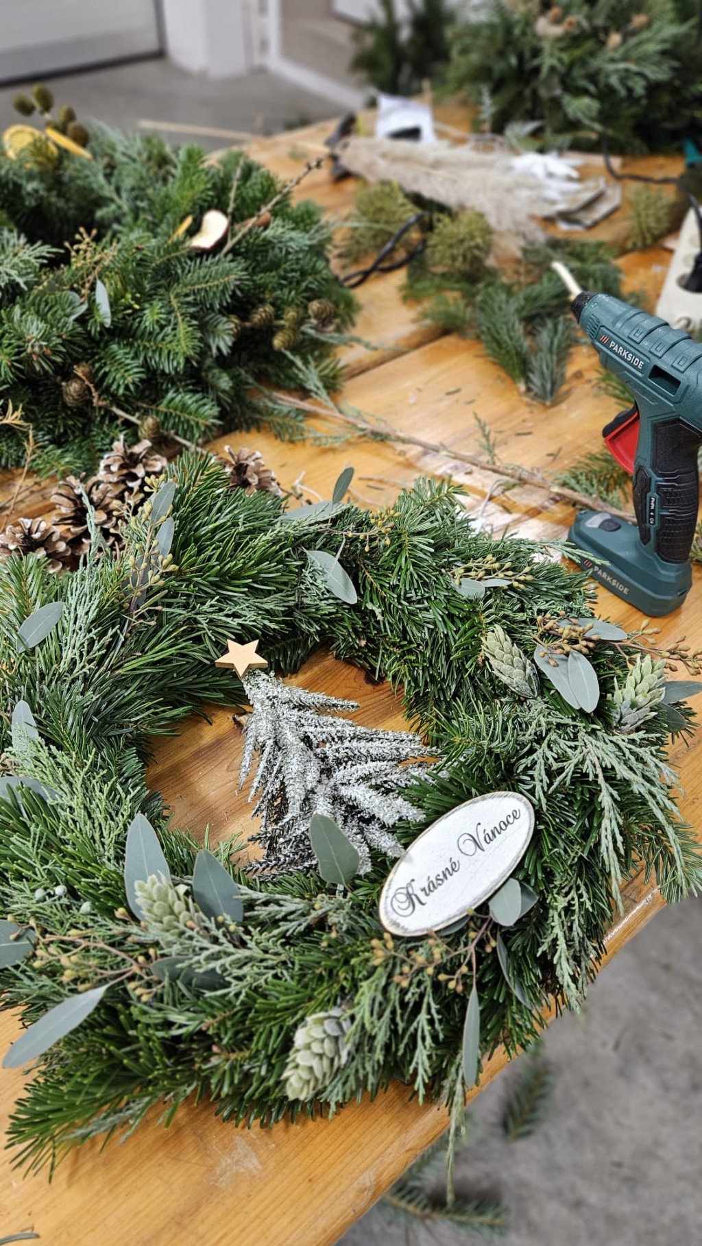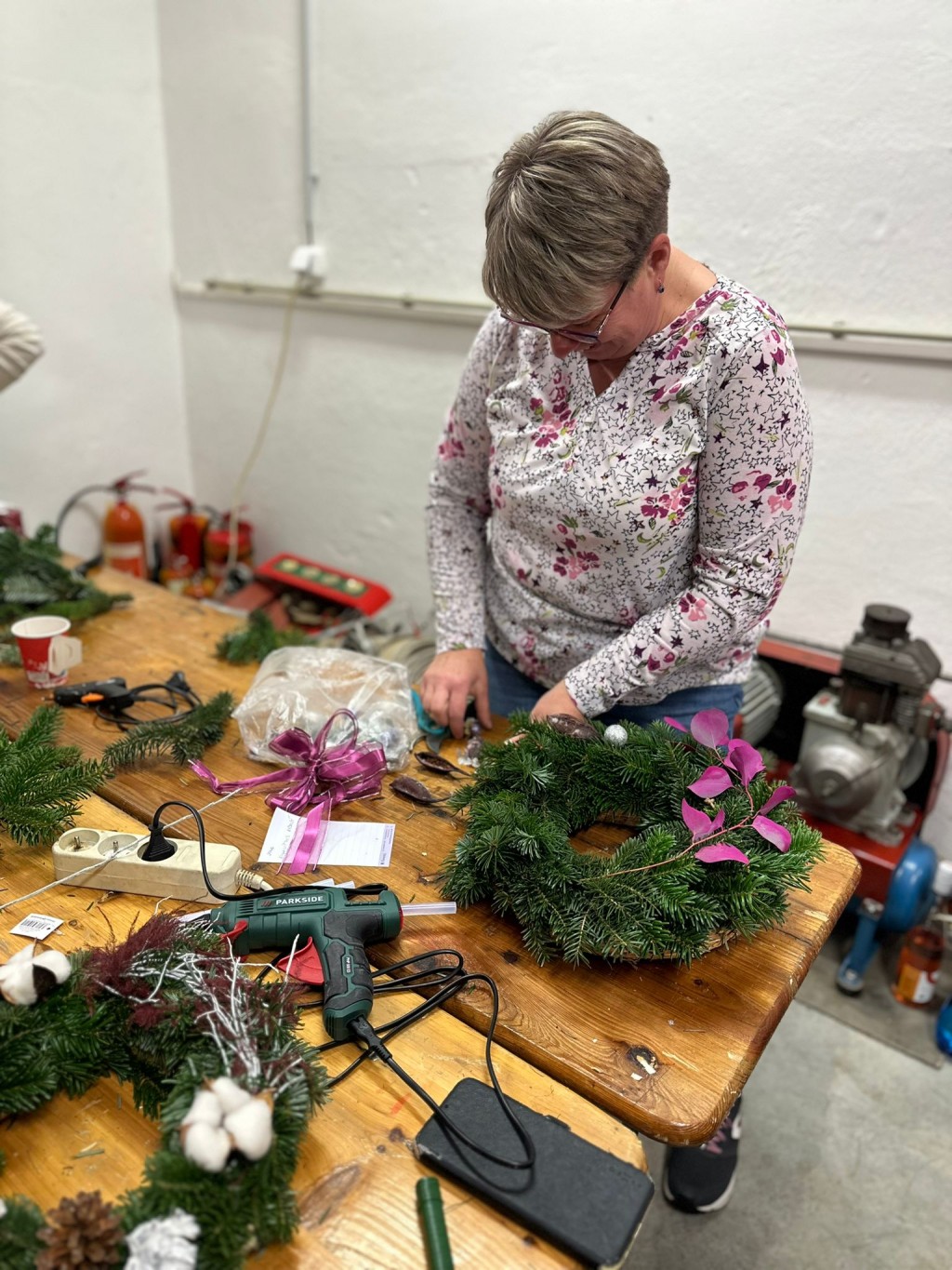 Pozvání přijala paní Tereza Štenclová z Kvítko Tereza z Bílého Újezda. Vzhledem ke kapacitě garáže byla účast omezena na 15 přihlášených osob. Každý si z domu mohl přinést přírodniny, svíčky, stuhy, ale byla i možnost zakoupení dekorace. Paní Tereza nám předvedla techniku vázání věnce, každý se pak dal do výroby. Při konečném zdobení nám byla opět k ruce a velice nám pomohla vše nadekorovat.
